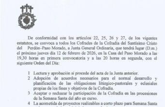 Se convoca a todos los cofrades de la Cofradía del Santísimo Cristo del Perdón – Paso Morado...